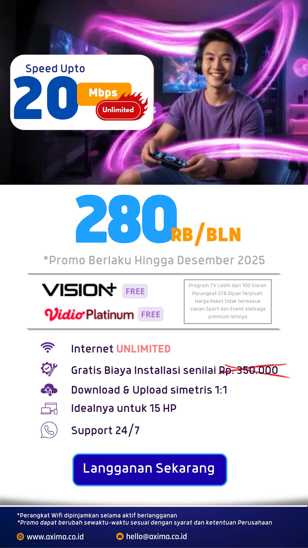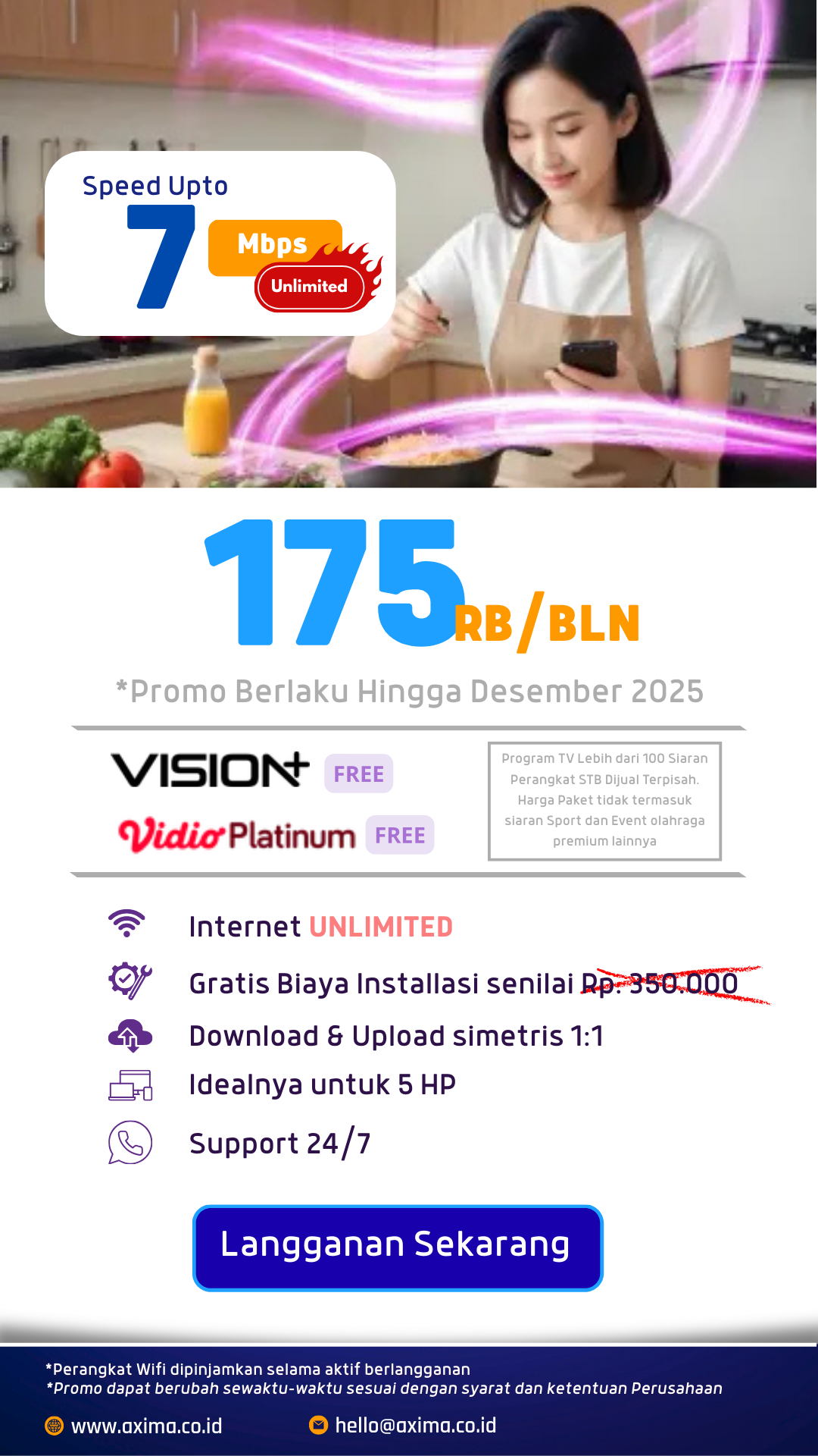 Biaya Pemasangan : Rp0,- Harga Paket bulanan : Rp. 185.000,- TOTAL : Rp. 185.000,-